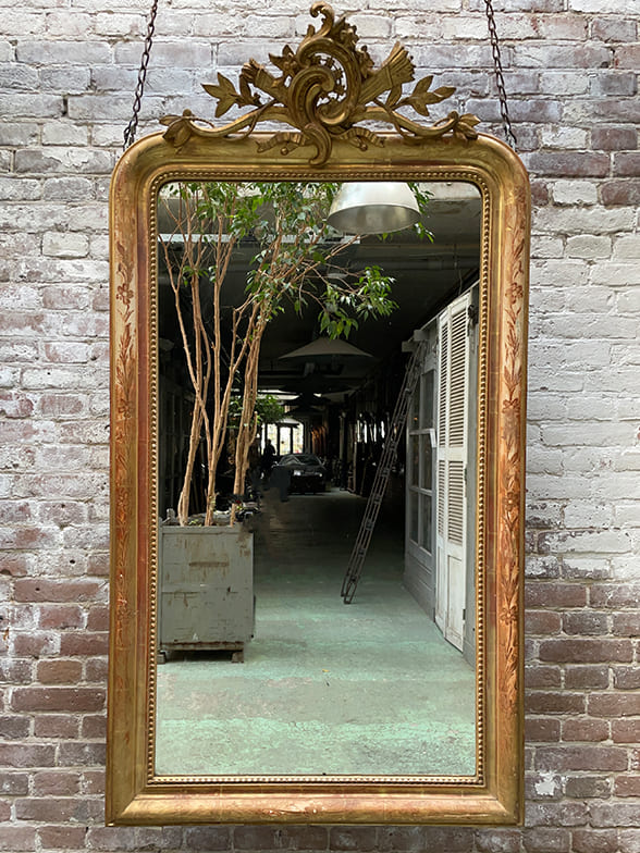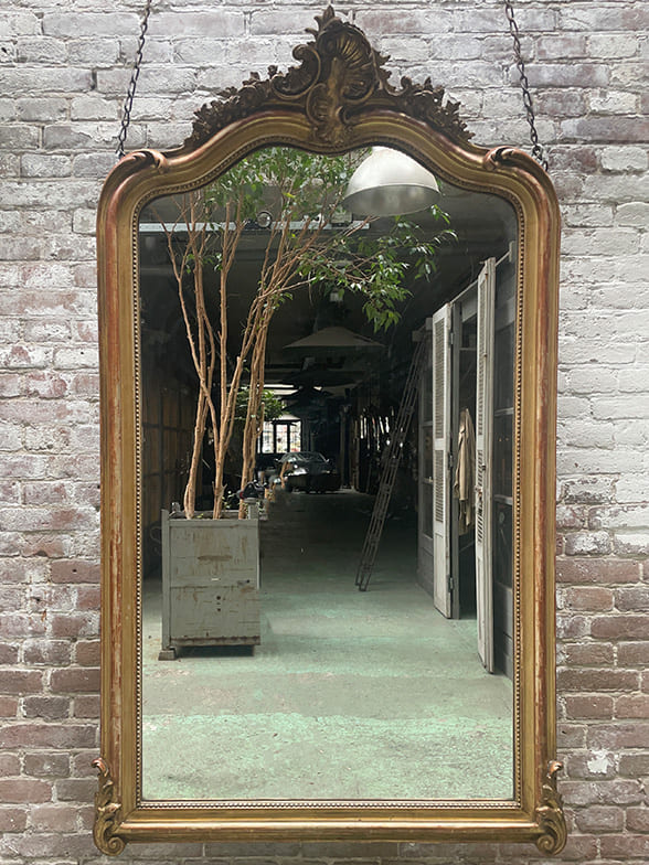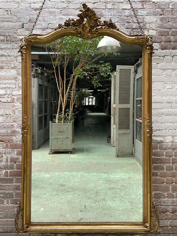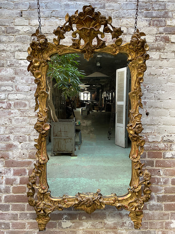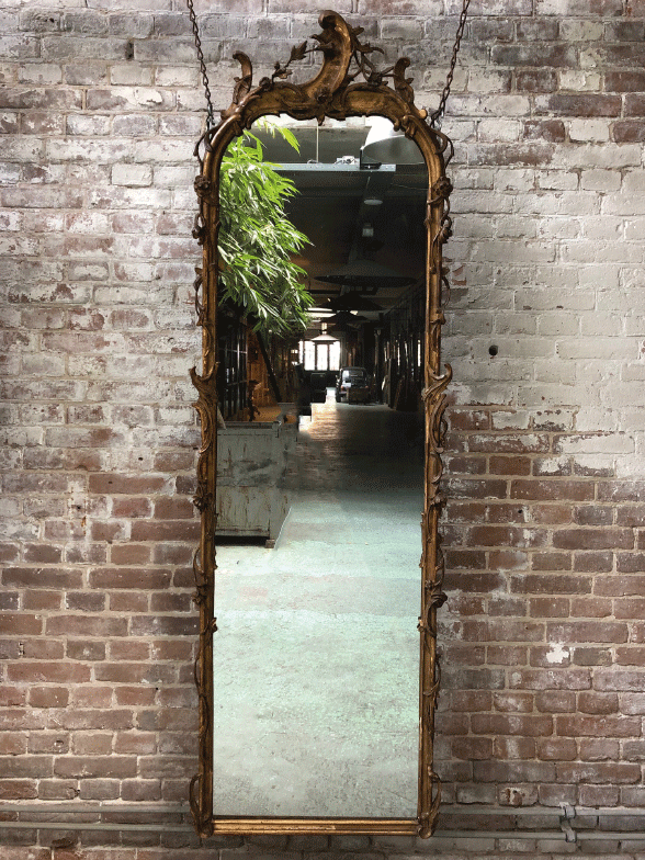 Zoals gezegd is elke spiegel uit de 18e eeuw een reflectie van een tijdsbeeld, veelal beïnvloed door de stijl van de heersende vorst. Waar de 18e eeuwse spiegellijsten hand gestoken zijn, is de 19e eeuwse “pâte-tegenhanger” minder bewerkelijk maar nog steeds een waar stuk vakmanschap. De profilering van de lijst is van hout. De ornamenten en kuif zijn nu gemaakt van pâte met een basis van ijzer. De eeuwenoude techniek van vergulding is ook hier gebruikt.